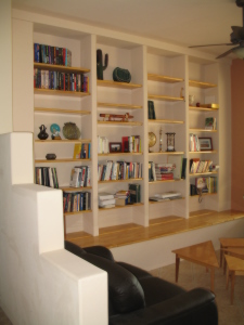 Let the construction begin. Most of you know Matt cannot leave well enough alone. Once the basics were moved in he began work on an 11 foot tall 14 foot wide bookcase for the living room. It took many evenings and weekends throughout April to finish. Many thanks to Brian who gave Matt a hand and offered up lots of great advice.